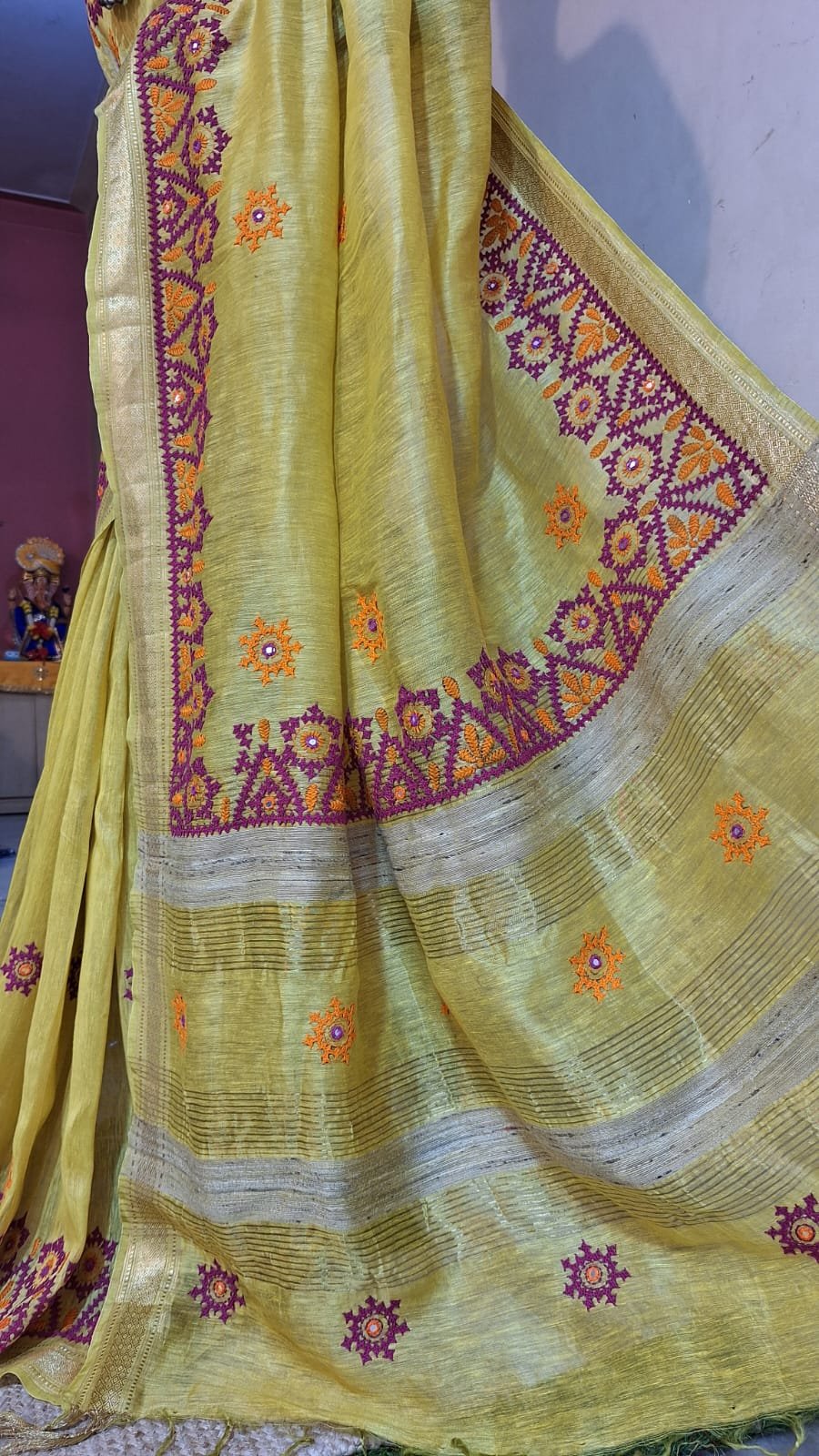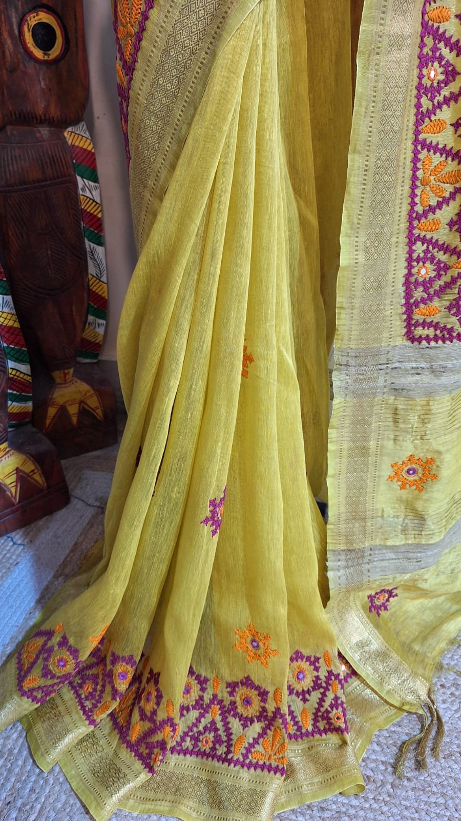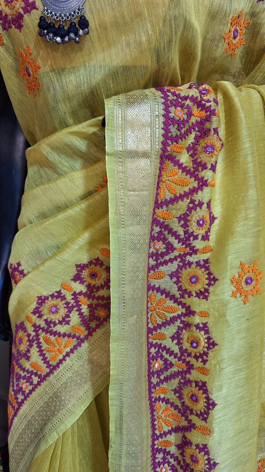 The highlight of this saree lies in its luxurious Silk Lilan fabric, known for its lightweight texture, smooth finish, and enduring quality. This fabric drapes beautifully around the body, offering comfort while enhancing your natural elegance. The Gujarati embroidery adorning the saree amplifies its charm, showcasing artistic patterns that pay homage to rich cultural heritage.