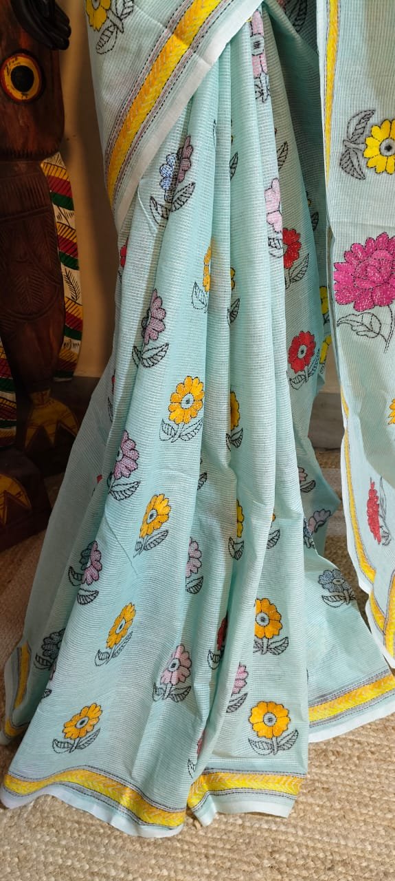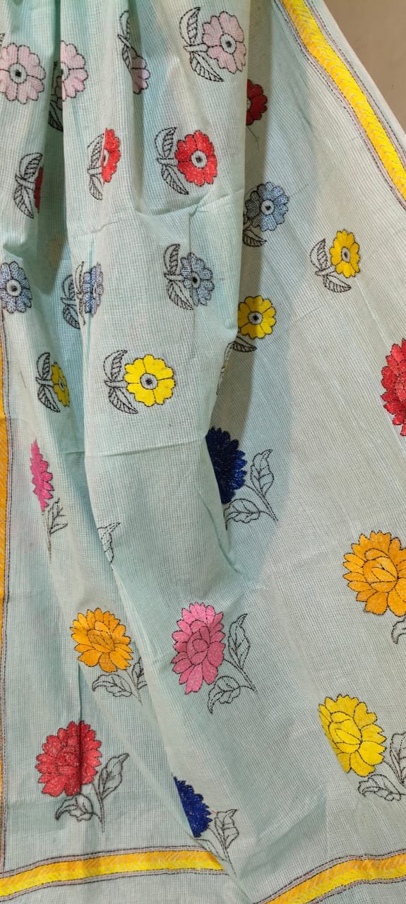 The standout feature of this saree is its intricate Kantha embroidery—a traditional art form that adds sophistication and charm to the fabric. Each motif is delicately stitched, telling a unique story and enhancing the visual appeal of the saree. Kantha work transforms this saree into more than just an outfit; it’s a piece of wearable art that will make you center stage at any gathering. The vibrant patterns and minimalist designs pair seamlessly, catering to modern tastes while honoring age-old traditions.