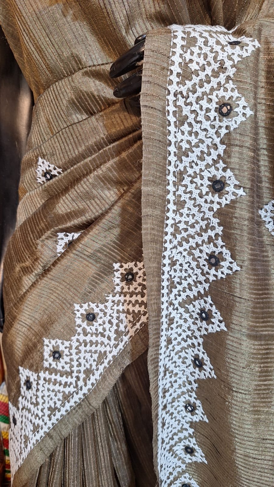 The highlight of this Motka Tussar saree is the beautifully detailed Gujarati embroidery, an artisanal masterpiece that sets it apart from the rest. Each motif is meticulously handcrafted, showcasing the rich cultural heritage while adding vibrant patterns to the natural tussar silk canvas. From traditional floral designs to geometric patterns, the embroidery breathes life into the fabric, making it a visual delight. Neelam Creation guarantees authenticity and quality, ensuring that you receive a saree cherished for its craft and creativity.