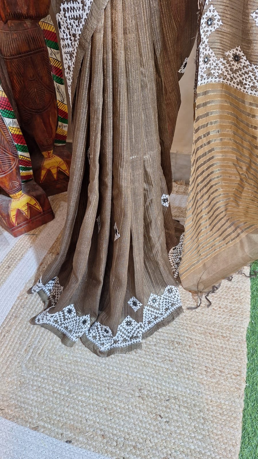 Introduce a touch of sophistication to your wardrobe with the exquisite Motka Tussar saree featuring intricate Gujarati work. Designed exclusively for Neelam Creation, this saree represents a harmonious blend of tradition and modern artistry. Crafted from high-quality tussar silk, known for its natural texture and subtle sheen, this saree is an epitome of unparalleled grace and versatility. Perfect for festivities, weddings, or even formal gatherings, it effortlessly embodies elegance in every drape.