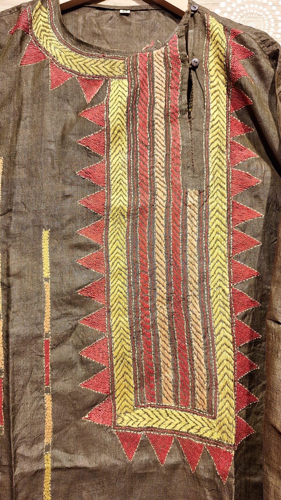 Versatile and stylish, the Tussar Panjabi with Kantha work is a must-have for anyone who values elegance and heritage. Pair it with churidar or pajama trousers to effortlessly complete your festive or formal look. Available in a range of sizes, our Panjabi ensures a flattering fit for gentlemen of all ages. Additionally, the breathable nature of Tussar silk makes it suitable for year-round wear, offering maximum comfort without compromising style. Choose the Tussar Panjabi by Neelam Creation and celebrate timeless craftsmanship that brings tradition closer to you.