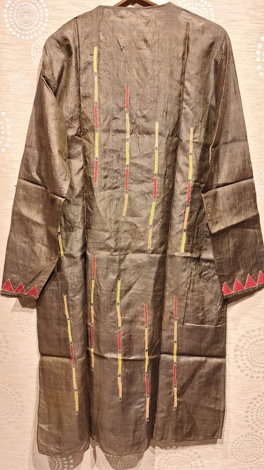 Discover the perfect blend of tradition and modern craftsmanship with our Tussar Panjabi adorned with exquisite Kantha work. Designed by Neelam Creation, this attire embodies sophistication and is ideal for any special occasion or festive gathering. The lightweight Tussar silk fabric offers unmatched comfort and durability, making it a versatile addition to your wardrobe. Experience the rich heritage of Kantha embroidery—a vibrant expression of cultural artistry—that enhances this Panjabi’s visual appeal.
