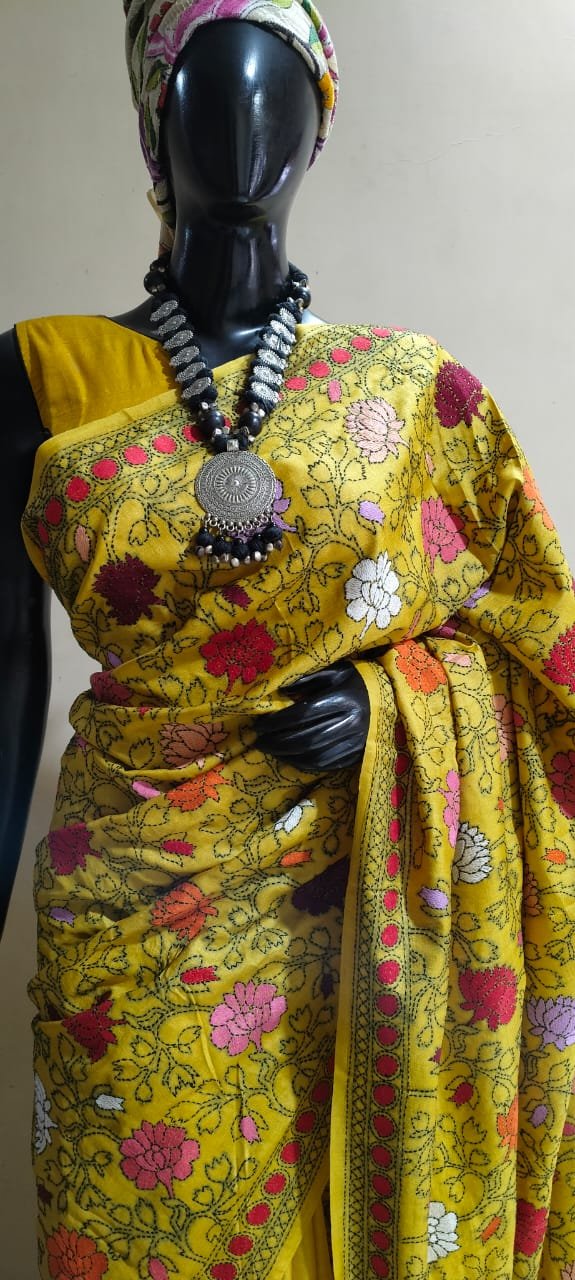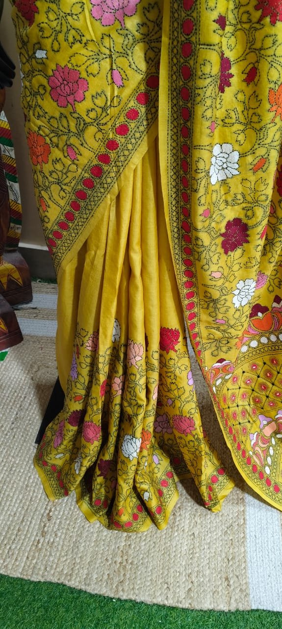 The Tussar Kantha Stitch Saree is crafted for connoisseurs who appreciate authentic artistry. The intricate Kantha stitching, a traditional embroidery method originating from Bengal, transforms the saree into a wearable masterpiece. Tussar silk, known for its natural texture and subtle sheen, complements the detailed embroidery to create a harmonious balance of grace and charm. Each stitch tells the story of dedication and skill, making this saree not just attire but a piece of art.